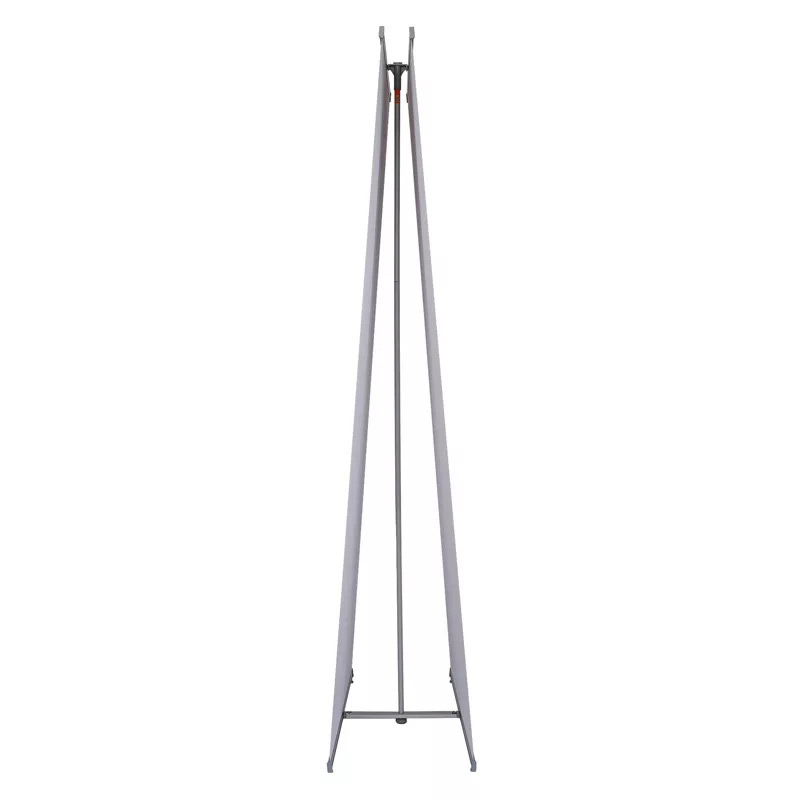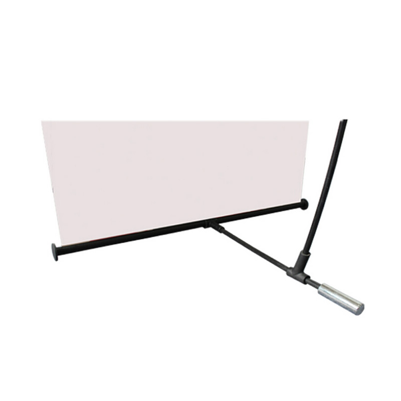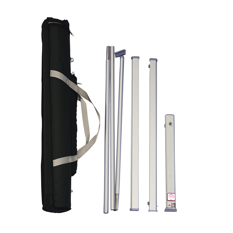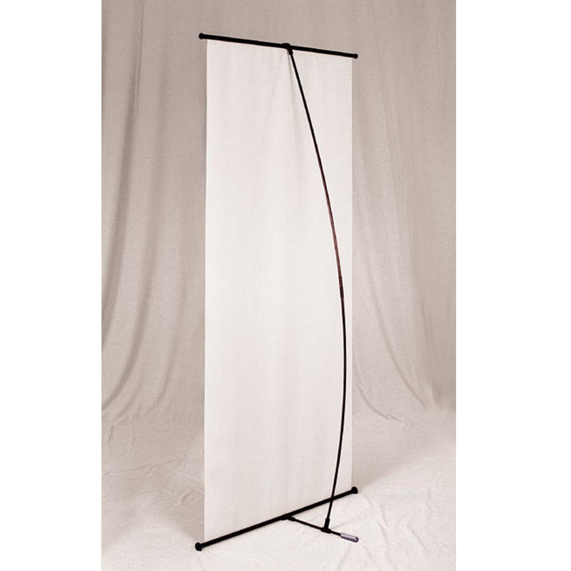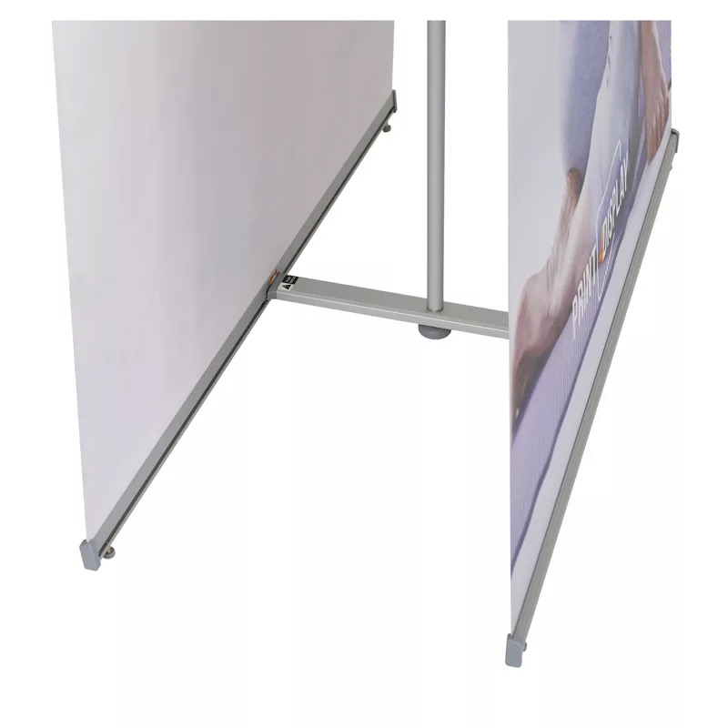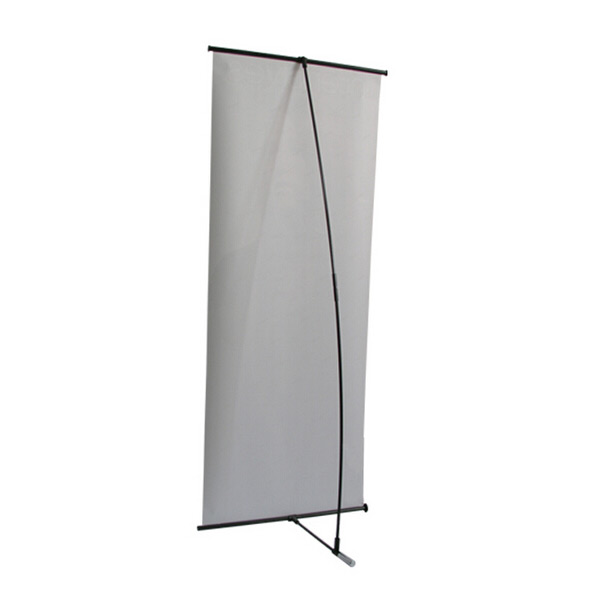 Упрощенная модель мобильного выставочного стенда L-баннер состоит из двух задвижных алюминиевых направляющих для крепления фотополотна и распорной стойки с опорой из прочного пластика.