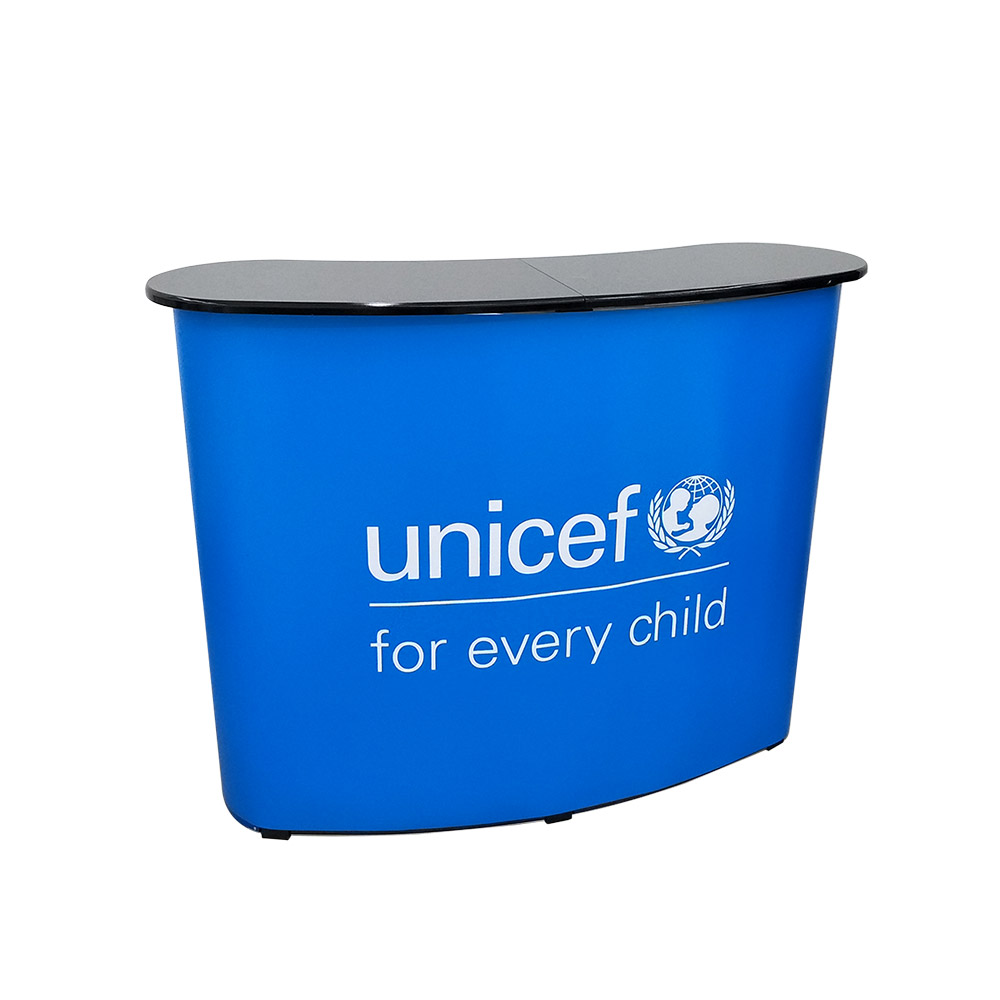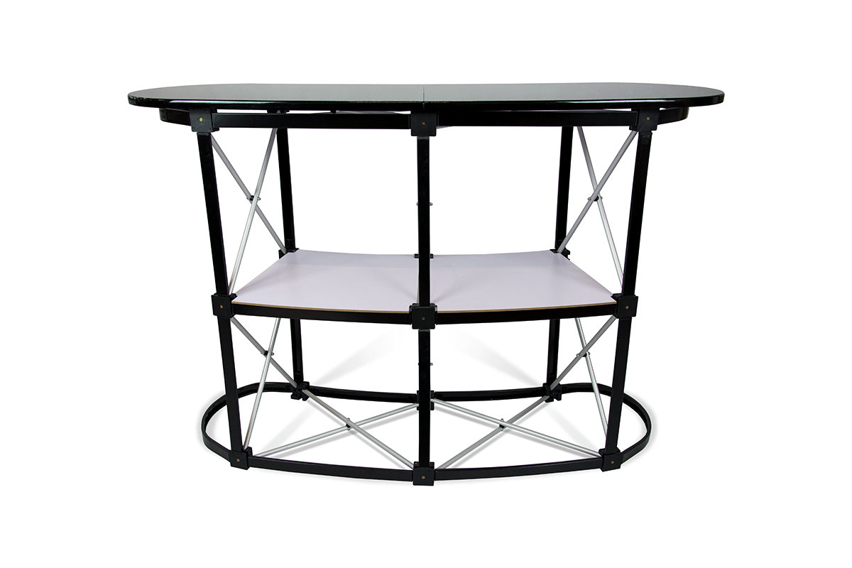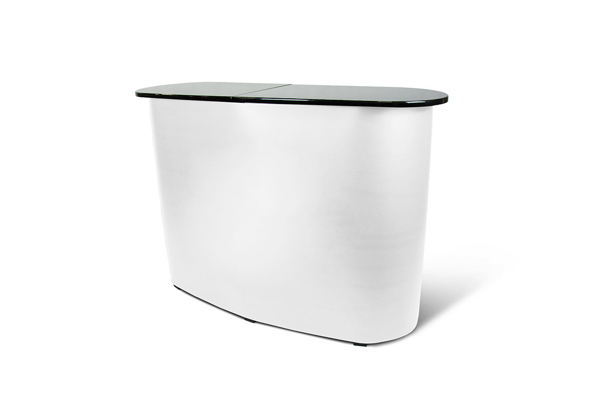 Стойка-ресепшн со складной зонтичной решеткой ПопАП из анодированных алюминиевых трубок квадратного сечения и пластиковых ребер жесткости с металлическими полосами для крепления фотопанели с магнитными лентами, комплектуется складной столешницей и внутренней полкой.