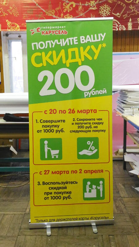 Конструкция Ролл-ап чаще всего используются на различных мероприятиях, акциях, в магазинах или в торговых центрах. Достаточно купить Roll-Up один раз, и в дальнейшем конструкцию не надо будет менять полностью, а всего лишь менять полотно.