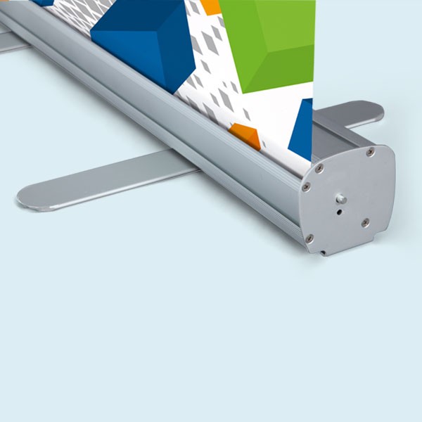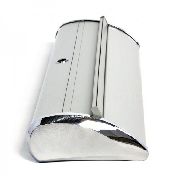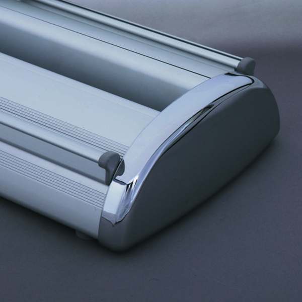 Премиальная модель стенда Roll Up с усиленной и расширенной опорной базой в форме капли, прочной утолщенной вертикальной опорой, усиленной зажимной верхней планкой и прочной двойной сумкой-чехлом с уплотнителем. Каждая конструкция дополнительно упакована в индивидуальную картонную коробку, еще лучше защищающую мобильный стен от повреждений при транспортировке. Корпус серебряного цвета с хромированными объемными боковинами в форме капли и серыми наконечниками. Вес с фотополотном от 5 до 9 кг в зависимости от размера.