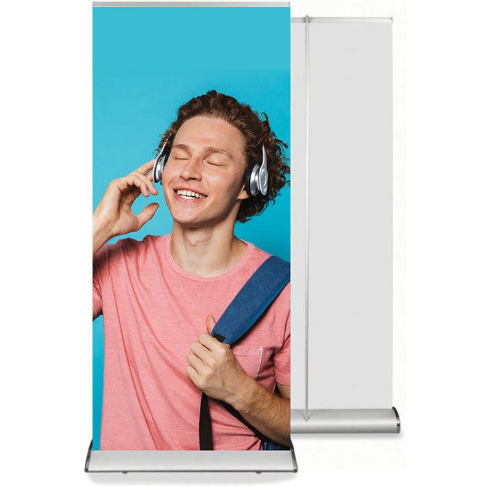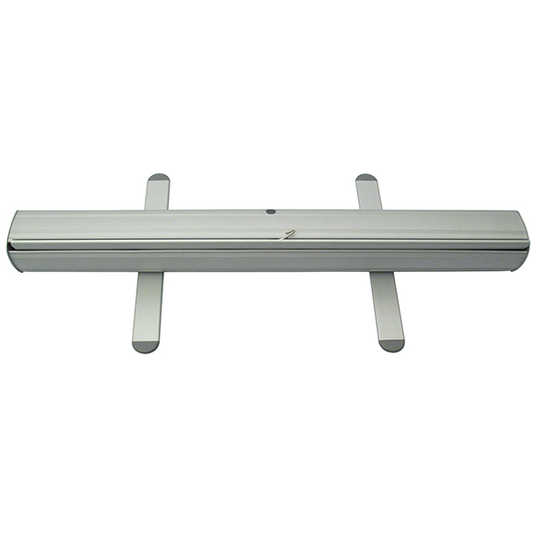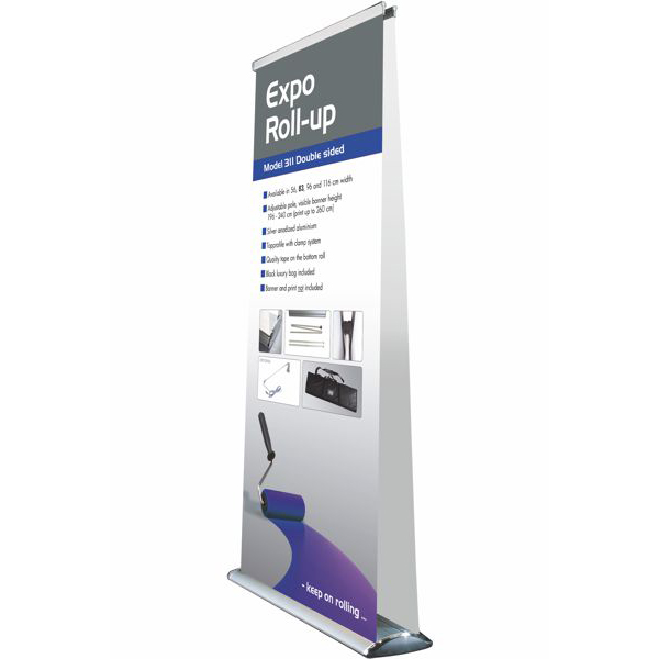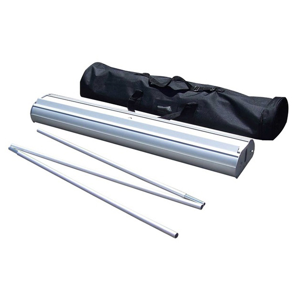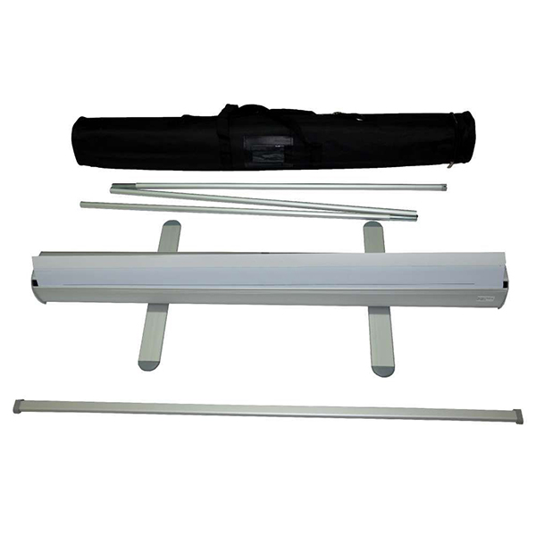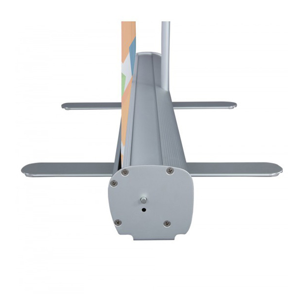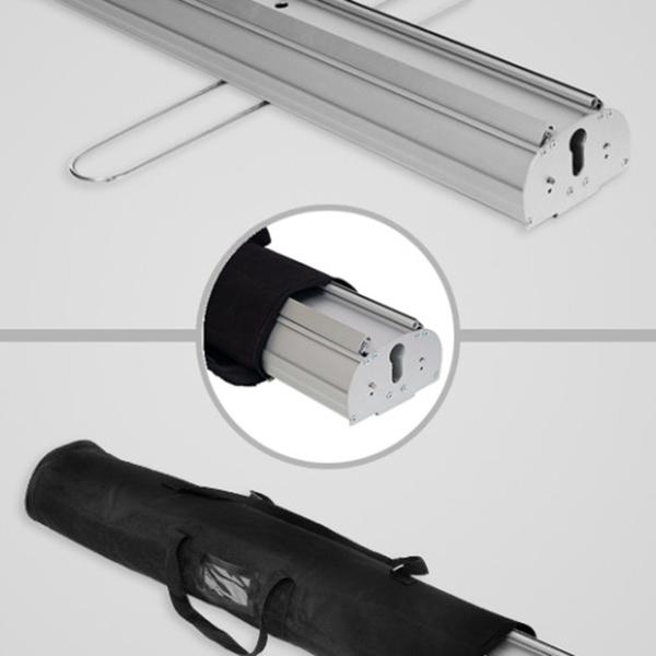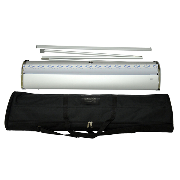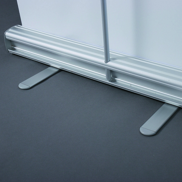 Модель стенда Roll Up с двумя рекламными поверхностями, расширенной и усиленной базой из толстого алюминиевого профиля с одной увеличенной опорной ножной, двумя усиленными зажимными верхними планками и прочной двойной сумкой-чехлом для перевозки. Корпус серебряного цвета с серыми наконечниками. Вес с фотополотном от 6 до 7 кг в зависимости от размера.